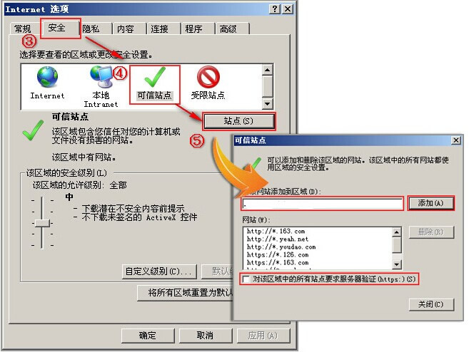 ⑤在“可信站点”的设置中,点击“站点”,在弹出的站点窗口中输入我们的网址如“http://